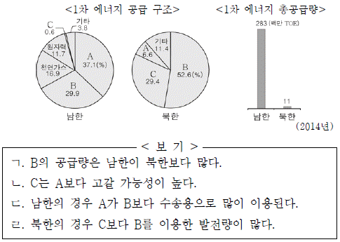 다음 자료의 A ~ C 에너지 자원에 대한 옳은 설명을 <보기>에서 고른 것은? [3점]