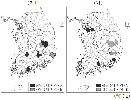 지도는 (가), (나) 인구 지표의 상위와 하위 5개 지역을 각각 나타낸 것이다. 이에 대한 설명으로 옳은 것은? (단, (가), (나)는 노년 부양비, 유소년 부양비 중 하나임.) [3점]