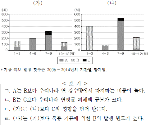 그래프는 (가), (나) 지역의 기상 특보 발령 횟수를 나타낸 것이다. 이에 대한 옳은 설명만을 <보기>에서 있는 대로 고른 것은? (단, (가), (나)는 강원도와 제주도 중 하나이며, A ~ C는 대설, 태풍, 호우 중 하나임.)