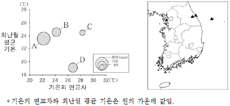 그래프는 지도에 표시된 지역의 기후 자료이다. 이에 대한 설명으로 옳은 것은? [3점]