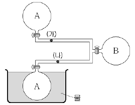 부피가 같은 두 용기 (가)와 (나)에 콕이 잠긴 상태에서 같은 온도의 헬룸 기체를 넣었더니 수은 기둥의 높이가 그림과 같이 되었다.