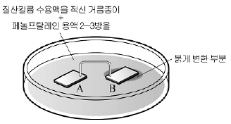 그림과 같이 금속 A와 B를 제트리접시 위에 올려놓고 구리선으로 연결하였더니 금속 A의 질량이 감소하였고, 금속 B주변 수용액의 색깔이 붉게 변하였다.