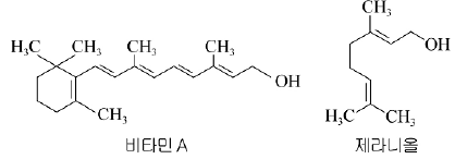 그림은 비타민 A와 장미꽃잎에 들어있는 제라니올의 구조식을 나타낸 것이다.