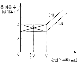 그래프는 염화바륨(BaCl2)수용액과 수산화칼륨(KOH)수용액에 5% 묽은 황산(H2SO4)을 각각 조금씩 가해줄 때 혼합 용액 속 총 이온 수의 변화를 나타낸 것이다.