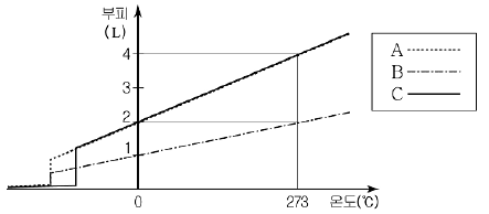 그림은 1기압에서 물질 A, B, C의 온도에 따른 부피 변화를 나타낸 것이다.