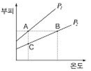 그림은 헬륨 1g의 압력을 각각 P1과 P2로 유지하면서 온도에 따른 부피 변화를 측정하여 나타낸 것이다.