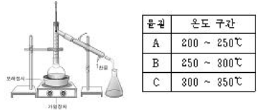 그림은 정유의 성분 물질을 분리하기 위한 실험 장치이고, 표는 경유로부터 분리된 물질 A, B, C가 얼어진 온도 구간이다.