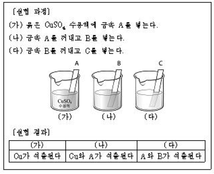 다음은 금속 A, B, C의 반응성을 알아보기 위한 실험이다. (단, A, B, C는 임의의 기호이다.)