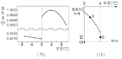 [과목 구분 없음] 그림 가 ( )는 온도에 따른 물의 밀도를, (나)는 표면이 얼어 있는 어떤 호수의 깊이에 따른 수온을 나타낸 것이다.