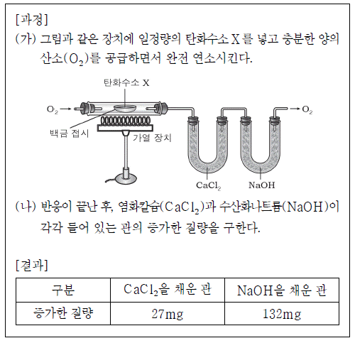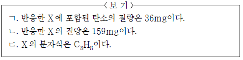 - 보기 ㄷ: 실험 결과 탄소의 질량이 2g으로 나왔는데, 이는 탄소 원자 1개가 아닌 탄소 원자 2개가 결합한 형태의 질량이다. 따라서 이 실험 결과로는 X의 분자식을 구할 수 없다.
