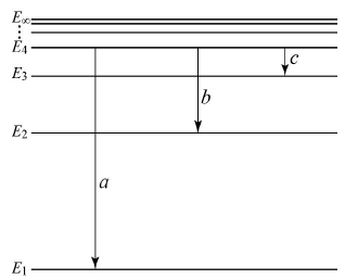 그림은 수소 원자의 에너지 준위와 몇 가지 전자 전이를 나타낸 것이다.