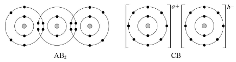 그림은 화합물 AB2와 CB의 전자 배치를 모형으로 나타낸 것이다.