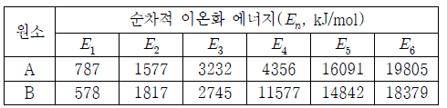 표는 3주기 원소 A와 B의 순차적 이온화 에너지(En)를 나타낸 것이다.