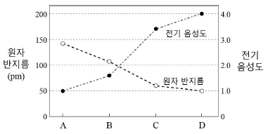그림은 임의의 2주기 원소 A~D의 원자 반지름과 전기 음성도를 나타낸 것이다. 단, 화합물 BC는 이온 결합 물질이다.
