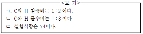 물질 X에 대한 설명으로 옳은 것만을 <보기>에서 있는 대로 고른 것은? (단, 원자량은 H=1, C=12, O=16이고, 물질 X는 완전 연소한다.) [3점]