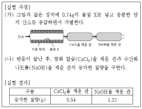 다음은 C, H, O 원소로 구성된 어떤 물질 X의 실험식을 구하는 원소 분석 실험이다.
