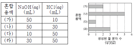 표는 수산화 나트륨(NaOH) 수용액과 묽은 염산(HCl)을 여러 부피비로 혼합한 용액 (가)~(라)를, 그림은 각 혼합 용액에서 중화 반응에 의해 생성된 물 분자 수를 상댓값으로 나타낸 것이다.