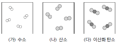 그림은 같은 온도와 압력에서 각 용기에 수소, 산소, 이산화탄소 기체를 같은 분자 수가 되도록 채운 것을 모형으로 나타낸 것이다.