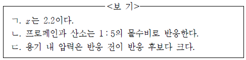 보기에서 정답이 "ㄴ"인 이유는 반응 전후의 산소의 질량이 같기 때문이다. 즉, 반응 전에는 산소 4.4g이 있었고, 반응 후에는 산소 0.4g이 남았으므로, 반응에 사용된 산소의 질량은 4.0g이다. 따라서, 프로페인과 반응한 산소의 질량은 각각 3/4 × 4.0g = 3.0g, 1/2 × 4.0g = 2.0g 이므로, 반응식은 C3H8 + 5O2 → 3CO2 + 4H2O이다. 따라서, 보기 중에서 "ㄴ"이 옳은 것이다.
