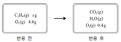 [과목 구분 없음] 그림은 프로페인(C3H8) g과 산소(O2) 4.4g이 들어 있는 강철 용기에서 프로페인은 모두 소모되고 산소는 0.4g이 남은 반응이 일어날 때 반응 전ㆍ후의 상태를 나타낸 것이다.