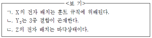 보기에서 정답이 "ㄴ"인 이유는 X, Y, Z 중에서 X와 Y가 모두 2개의 전자를 가지고 있기 때문이다. 이는 전자 구성이 비슷하다는 것을 의미하며, 이러한 원자들은 같은 주기에 속하게 된다. 따라서 X, Y, Z 중에서 X와 Y는 같은 주기에 속하고, Z는 다른 주기에 속하게 된다. 이에 따라 X, Y, Z의 원소 기호는 같을 수도 다를 수도 있다.