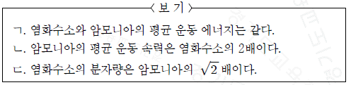 보기에서 "ㄱ"은 기체 분자의 질량이 작을수록 확산 속도가 빠르다는 것을 나타낸다. 이는 기체 분자의 질량이 작을수록 더 빠르게 움직이기 때문에 다른 분자와 충돌할 확률이 높아지기 때문이다. 따라서 질량이 작은 기체인 수소 분자가 가장 빠르게 확산한다.