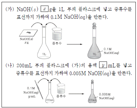 (가)의 NaOH(s)의 질량 x와 (나)의 0.1M NaOH(aq)의 부피 y는? (단, NaOH의 화학식량은 40이다.) (순서대로 x, y) [3점]