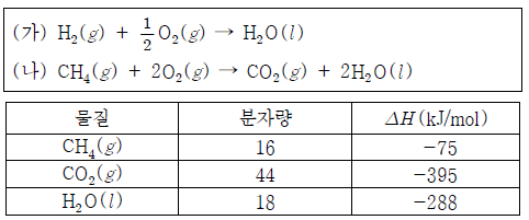 [과목 구분 없음] 다음은 25℃, 1기압에서 수소(H2)와 메테인(CH4)의 연소 반응식과 몇 가지 물질의 생성열(△H)을 나타낸 것이다.