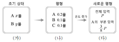 - (ㄱ) 기체 A와 B는 엔탈피가 감소하는 반응이므로 초기 상태 (가)에서는 냉각되어 있을 것이다. 따라서 초기 상태 (가)에서는 기체 A와 B의 압력이 낮을 것이다. 이후 온도를 증가시켰을 때, 엔탈피가 증가하는 반응이 일어나면서 새로운 평형 상태 (다)에서는 기체 C의 압력이 높아지게 된다.