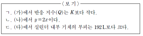이에 대한 설명으로 옳은 것만을 <보기>에서 있는 대로 고른 것은? (단, 대기압은 1 기압, 기체 상수(R)는 0.08기압·L/몰·K이고, 피스톤의 질량과 마찰은 무시한다.) [3점]