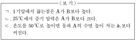 [과목 구분 없음] 그림은 25℃, 1기압에서 반투막으로 분리된 설탕물 A, B와 물이 평형 상태에 있는 것을 나타낸 것이다. h1 과 h2 는 각각 물과 설탕물 A, B의 수면 높이 차이고, h2 > h1 이다.
