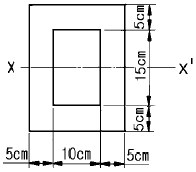 그림과 같은 내측이 비어 있는 단면의 보에서 X-X' 축에 대한 단면 2차 모멘트는 약 몇 ㎝4인가? (단, 직사각형 외측높이는 25cm, 폭은 20cm이고, 내측의 높 이는 15cm, 폭은 10cm 임)
