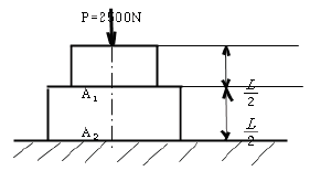[재료역학] 그림과 같이 길이가 동일한 2개의 기둥 상단에 중심 압축 하중 2500N이 작용할 경우 전체 수축량은 약 몇 mm인가? (단, 단면적 A1 = 1000mm2, A2 = 2000mm2, 길이 L =300mm, 재료의 탄성계수 E = 90GPa이다.)