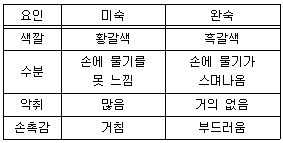 퇴비의 부숙도 판별 및 관능검사 방법 중 요인별로 미숙 / 완숙 구별방법이 틀린 것은?