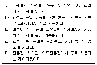 [유통마케팅] 격자형(grid type) 레이아웃에 대한 내용만을 모은 것은?