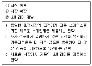 [유통마케팅] 소매업체들의 성장전략에 대한 설명의 짝으로 옳은 것은?