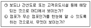 따라서, "㉠ 기점 – ㉡ 대상"은 점포를 중심으로 인지 대상의 크기와 형태를 평가하는 요소를 의미한다. 이는 점포의 시각적 가시성과 인지도를 높이는데 중요한 역할을 한다.