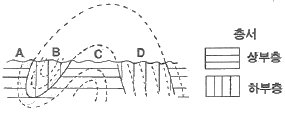 반면, "A" 지점은 지층이 내려가는 부분으로 강도(anticline)가 아닌 강경(syncline)입니다. "C" 지점은 지층이 평평한 부분으로, 강도나 강경이 아닌 평평한 지형을 나타냅니다. 마지막으로, "D" 지점은 지층이 내려가는 부분으로 강경(syncline)입니다.