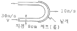 [기계유체역학] 그림의 날개가 제트의 방향을 180°바꾼다고 했을 때 제트에 의해서 날개에 작용하는 힘의 크기는 약 몇 N인가? (단, 마찰은 무시한다.)