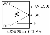 스로틀(밸브) 위치 센서에 그림과 같이 5V의 전압이 인가된다. 스로틀(밸브) 위치 센서가 완전히 개방시는 몇 V이 전압이 출력축(시그널)에 감지되는가?