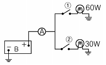 12V의 배터리에 12V용 전구 2개를 그림과 같이 결선하고① 및 ② 스위치를 연결하였을 때 A에 흐르는 전류는 얼마인가?