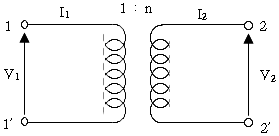 이상 변압기는 입력 전압과 출력 전압의 비율을 일정하게 유지하는 변압기이다. 그림에서 입력 전압이 A, B에 인가되고 출력 전압이 C, D에서 나오므로, 이상 변압기의 비율은 C/D = A/B 이다. 따라서, C/D = 1/n 이면 A, B, C, D는 "1/n, 0, 0, n"으로 표시된다.