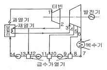 [전력공학] 고압고온을 채용한 기력발전소에서 채용되는 열 사이클로 그림과 같은 장치 선도의 열사이클은?