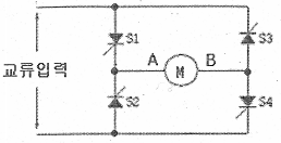 전동기 M의 전류 방향은 사이리스터 S1과 S4, S2와 S3의 동작 상태에 따라 결정된다. 그러나 이 회로에서는 사이리스터의 점화각이 0°이므로, S1과 S4, S2와 S3은 항상 동시에 동작하게 된다. 따라서 전류는 항상 A에서 B의 방향으로 흐르게 된다. 즉, 정답은 "항상 A에서 B의 방향"이다.