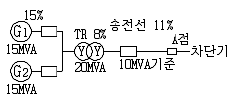 [전력공학] 그림과 같은 전력계통에서 A점에 설치된 차단기의 단락 용량은 몇 MVA인가? (단, 각 기기의 %리액턴스는 발전기 G1, G2는 정격용량 15MVA 기준 각각 15%이고, 변압기는 정격용량 20MVA 기준 8%, 송전선은 정격용량 10MVA 기준 11%이며, 기타 다른 정수는 무시한다.)