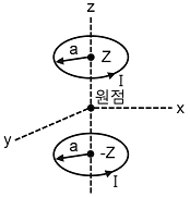 반지름 a[m]인 2개의 원형 선조 루프가 ±Z축 상에 그림과 같이 놓여진 경우 I[A]의 전류가 흐를 때, 원형 전류 중심축상의 자계 Hz [A/m]는? (단, az, aø는 단위벡터이다.)