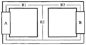아래의 그림과 같은 자기 회로에서 A부분에만 코일을 감아서 전류를 인가할 때의 자기 저항과 B부분에만 코일을 감아서 전류를 인가할 때의 자기저항 [AT/Wb]을 각각 구하면 어떻게 되는가? (단, 자기저항 R1=1, R2=0.5, R3=0.5이다.)