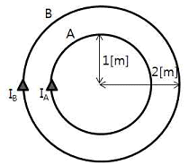 그림과 같은 원형 코일이 두 개가 있다. A의 권선수는 1회, 반지름 1[m], B의 권선수는 2회, 반지름은 2[m]이다. A와 B의 코일중심을 겹쳐 두면 중심에서의 자속이 A만 있을 때의 2배가 된다. A와 B의 전류비 IB/IA는?