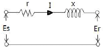 그림과 같은 단거리 배전선로의 송전단 전압 및 역률은 각각 6600[V], 0.9이고 수전단 전압 및 역률이 각각 6100[V], 0.8일 때 회로에 흐르는 전류 I[A]는? (단, r=10[Ω], x=20[Ω])
