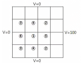 그림과 같은 정방형관 단면의 격자점 ⑥의 전위를 반복법으로 구하면 약 몇 [V]가 되는가?